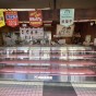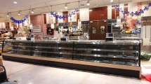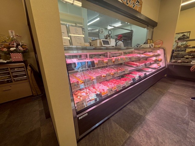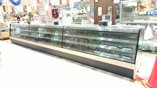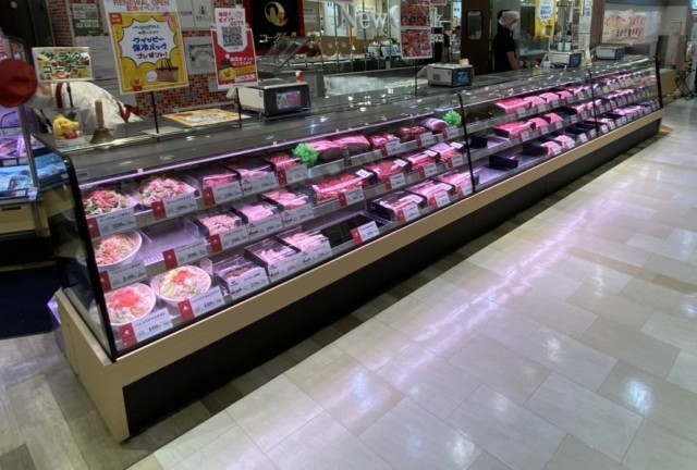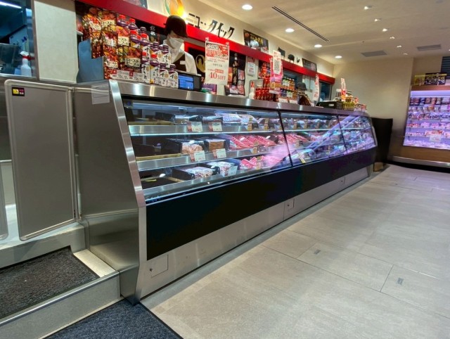 冷蔵ケースの方はハムなどの加工品。非冷ケースの方は揚げ物など1台のケースで2つのものが販売出来る。