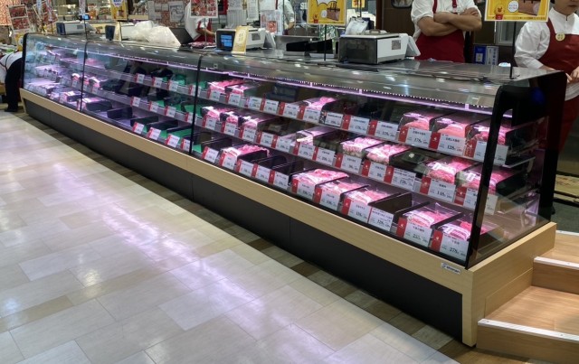 この精肉対面ケースは前面ガラスが引き出せるタイプです。