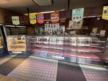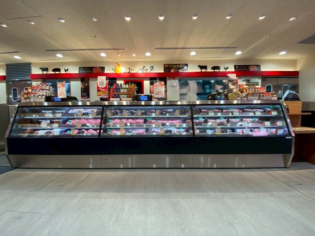 冷蔵ケースの方はハムなどの加工品。非冷ケースの方は揚げ物など1台のケースで2つのものが販売出来る。